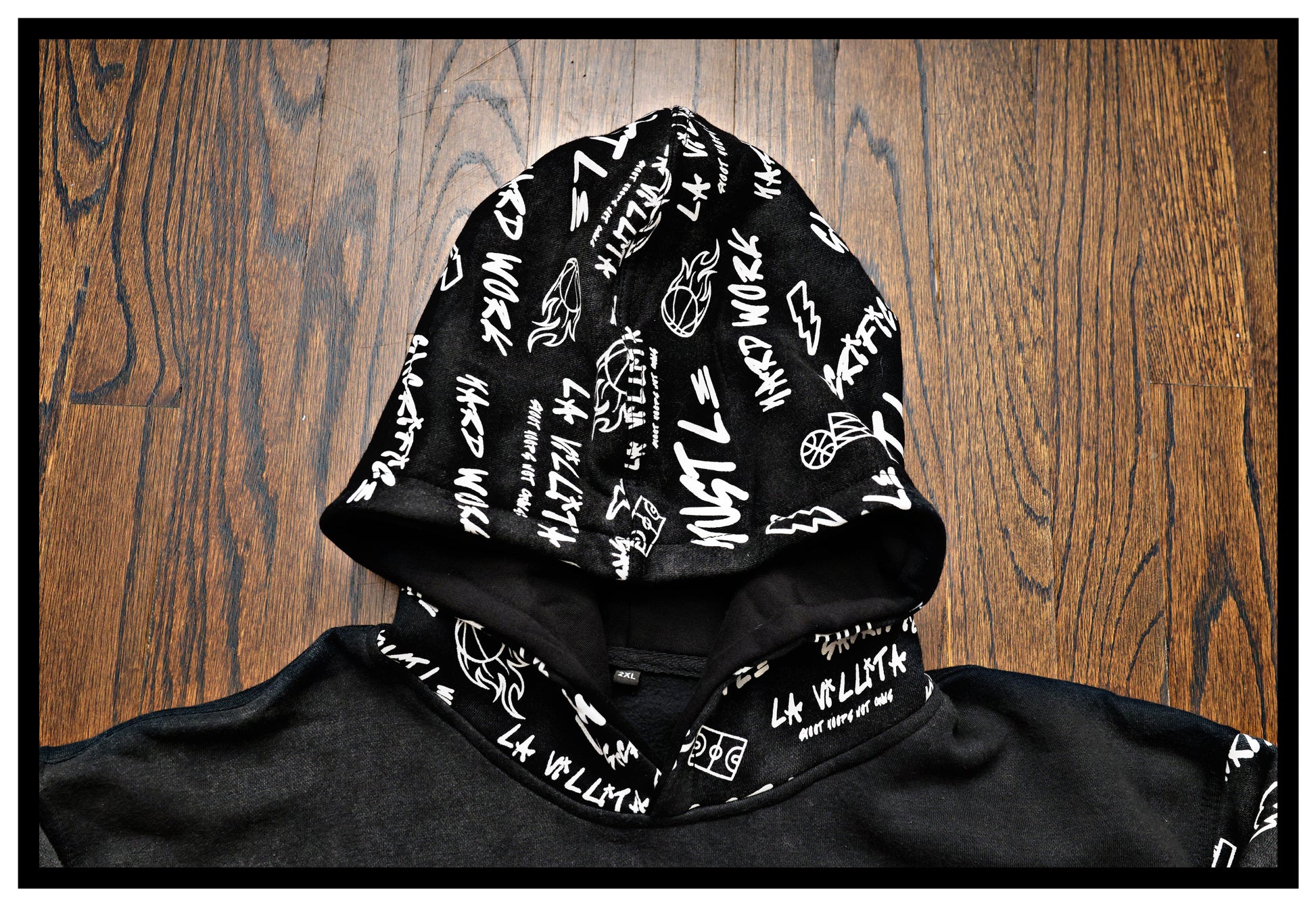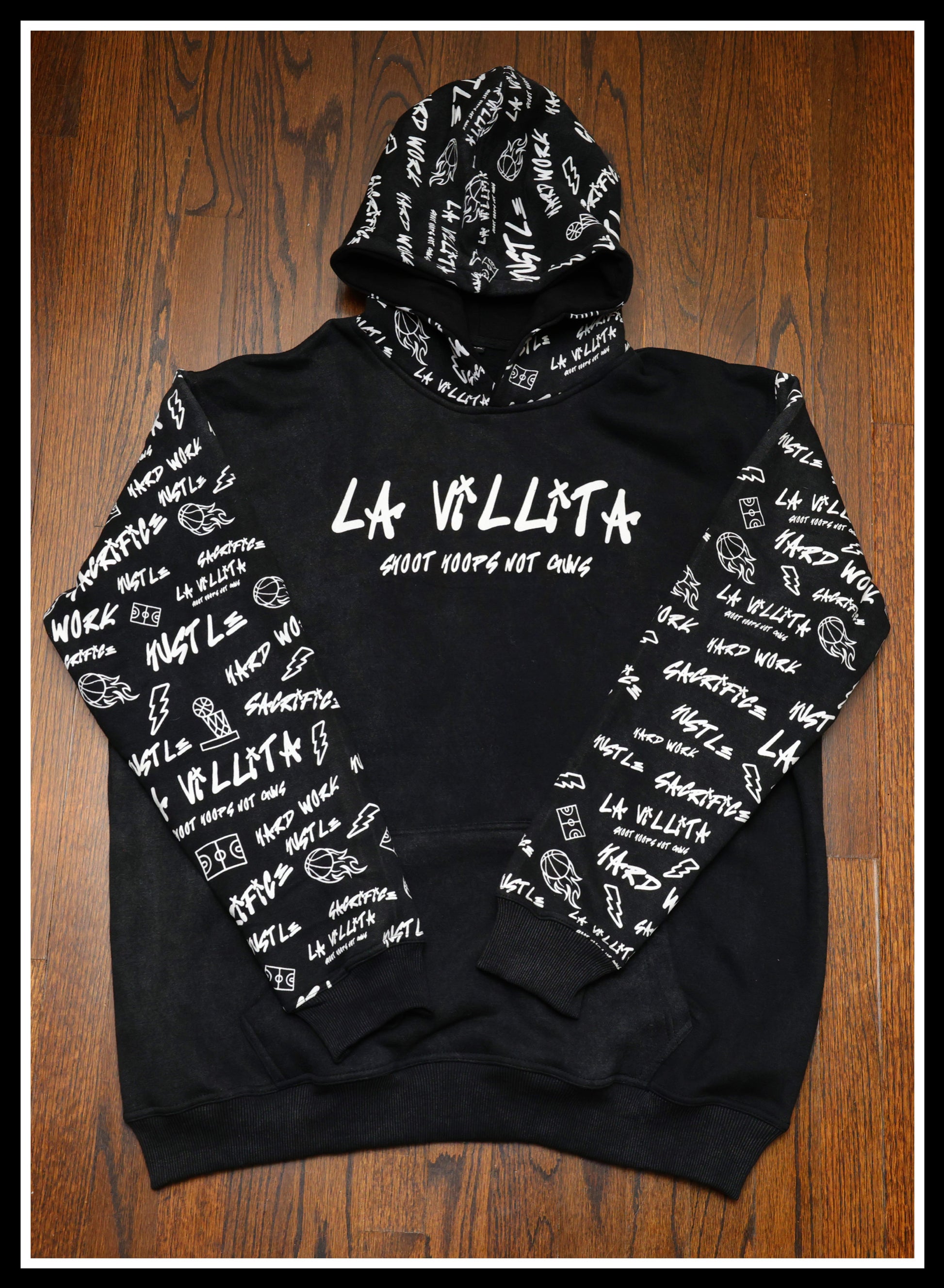 This premium black stone-washed hoodie is built from ultra-heavy 600 GSM cotton fleece, giving it a luxury weight, thick structure, and long-lasting durability. The body features a clean black finish, while the hood and sleeves are covered in bold white La Villita graphics — including “Hustle,” “Hard Work,” sacrifice icons, basketball line art, and the signature La Villita tag.